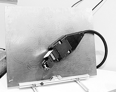 在展台上,记者看到一个像壁虎一样吸附在铁板上爬行的机器,不禁问道:它能干什么?