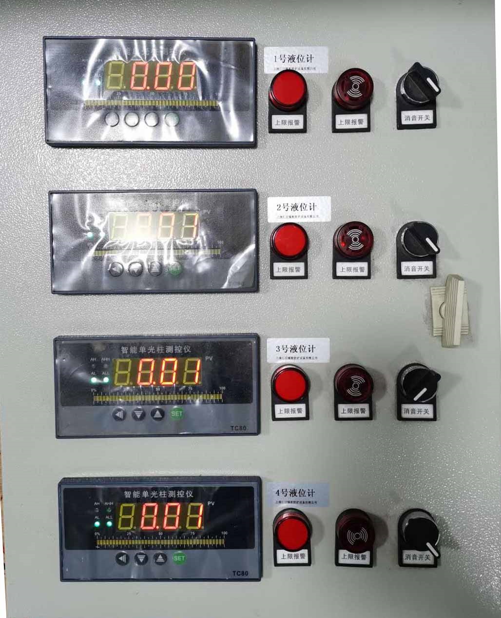 控制柜内部嵌入有多个液位变声器控制主机,该主机能实时采集液位变送器的数据,并更加设定的报警阈值给出 上下限阈值声光报警的功能